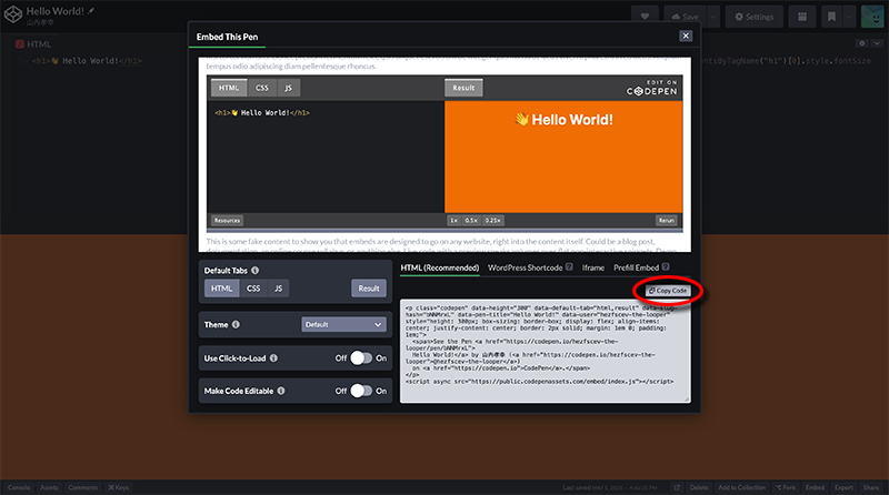 「CodePen」で埋め込みコードを取得