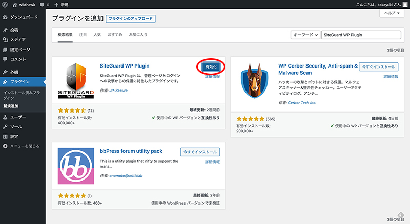 ①「キーワード」で「Site Guard WP Plugin」を検索