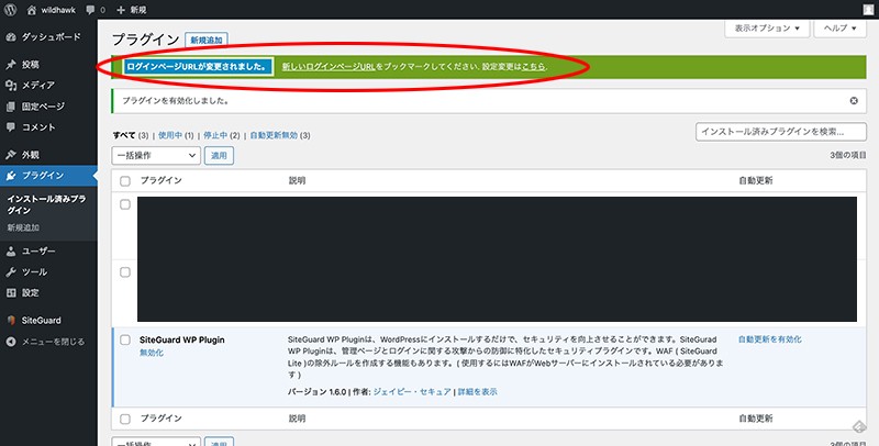 【重要】有効化すると、管理画面のURLが変更されます。必ず「新しいログインページURL」をブックマークしてください。