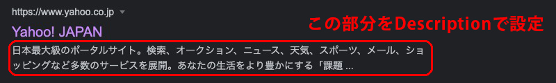<meta name=”description” content=”日本最大級のポータルサイト。検索、オークション、ニュース、天気、スポーツ、メール、ショッピングなど多数のサービスを展開。あなたの生活をより豊かにする「課題…”>