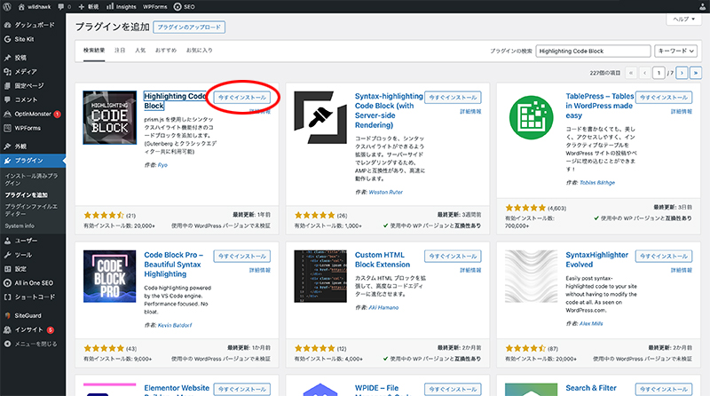 ②検索結果から「Highlighting Code Block」の「今すぐインストール」をクリック。