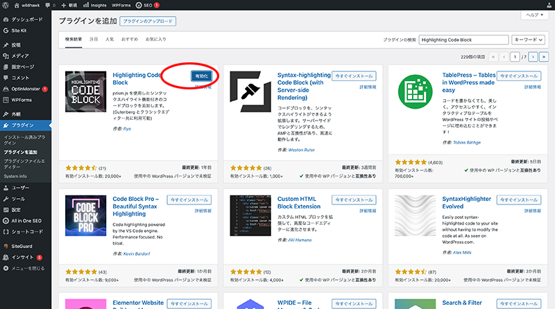 WordPressの管理画面で、プラグインの新規追加から「Highlighting Code Block」と検索してインストールしてください。