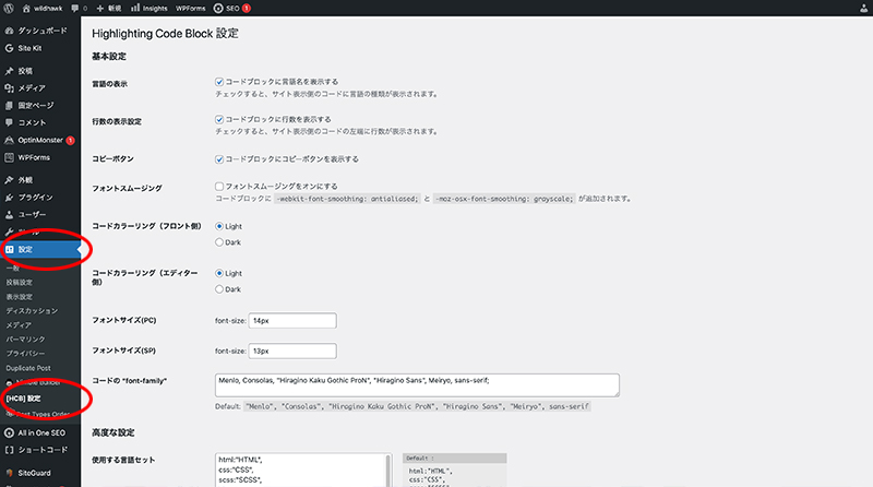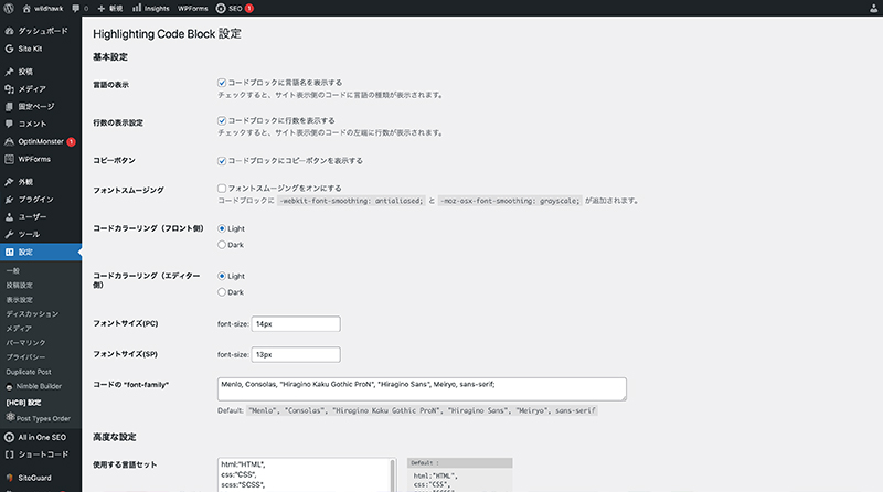 「Highlighting Code Block」の詳細設定は、以下から可能です。