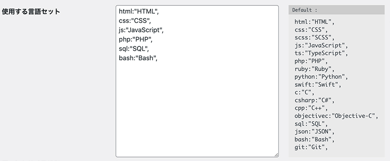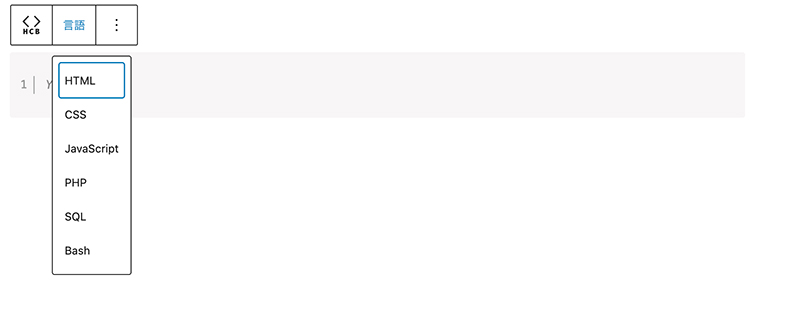 コードブロックでの言語選択セレクトボックスで表示される言語が上記の設定に合わせて変更されます。