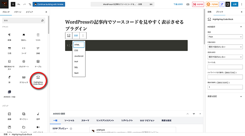 「Highlighting Code Block」の使い方(ブロックエディタ)