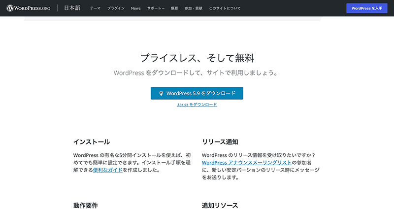 WordPressの公式サイトから、WordPressをダウンロードします。