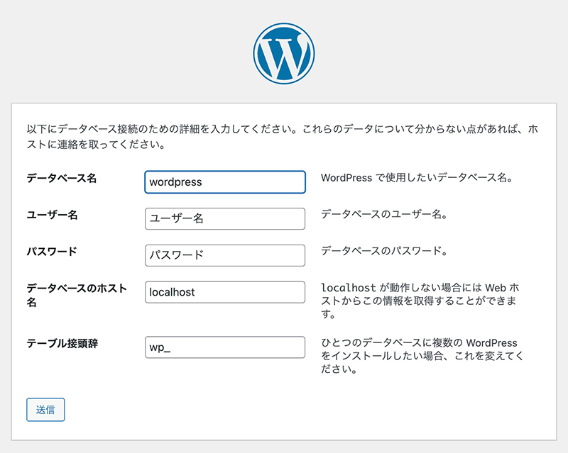 WordPressで利用するデータベースの情報を入力し、「送信」ボタンをクリックします。