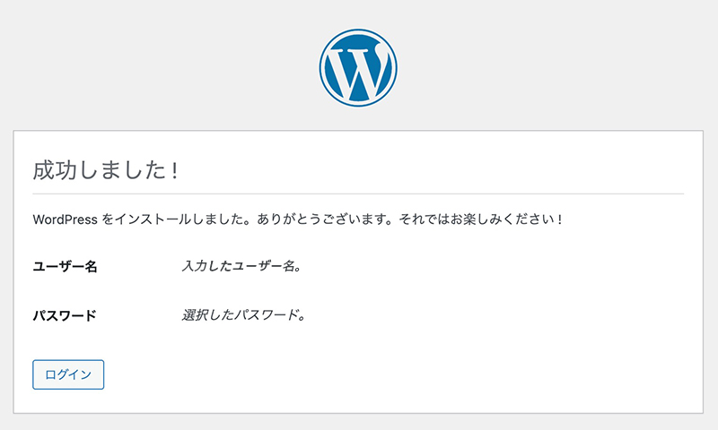 ※管理画面のURLはブックマークするなど、保管した方が便利ですが、後から設定するセキュリティー設定でURLは変更する予定なので、ここでは必要ありません。